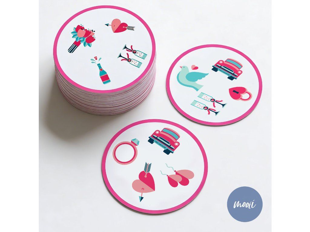 A kártyák grafikai kialakítása és az ikonok elrendezése saját tervezésű, gondosan készített játék, amely tökéletes választás köszönetajándéknak gyerekeknek, vagy esküvői gyereksarok kreatív játékeszközének.