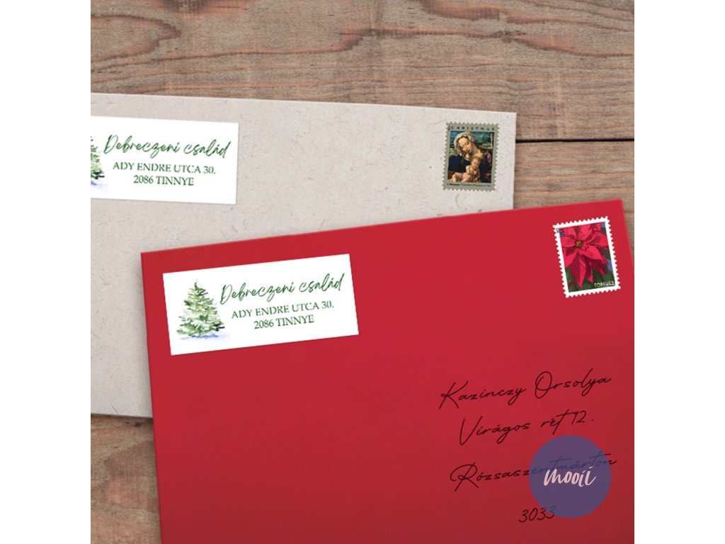 Egyedi karácsonyi matricacsomag, akvarell fenyő mintával, a családi címzéssel ellátva!